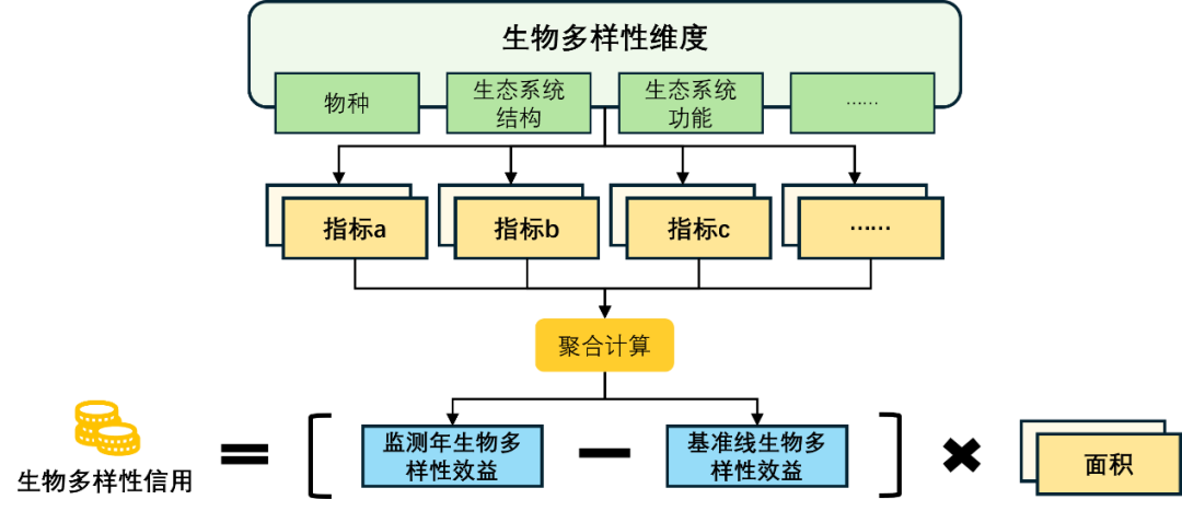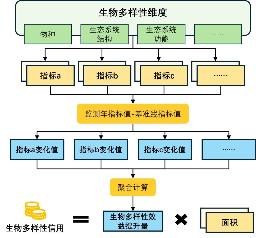 较为常见的核算方法是选择一系列指标代表生物多样性的不同维度,采用加和、平均等指标聚合计算方式,分别计算出保护和恢复行动和基准线情景下某监测年对应的生物多样性状态或效益,两者相减计算得出的差值即生物多样性净增益,再与面积相乘,得出监测年的生物多样性信用数量。或先根据指标在保护和恢复行动和基准线情景下的变化量,再进行聚合计算,最后与面积相乘,得出监测年的信用数量。