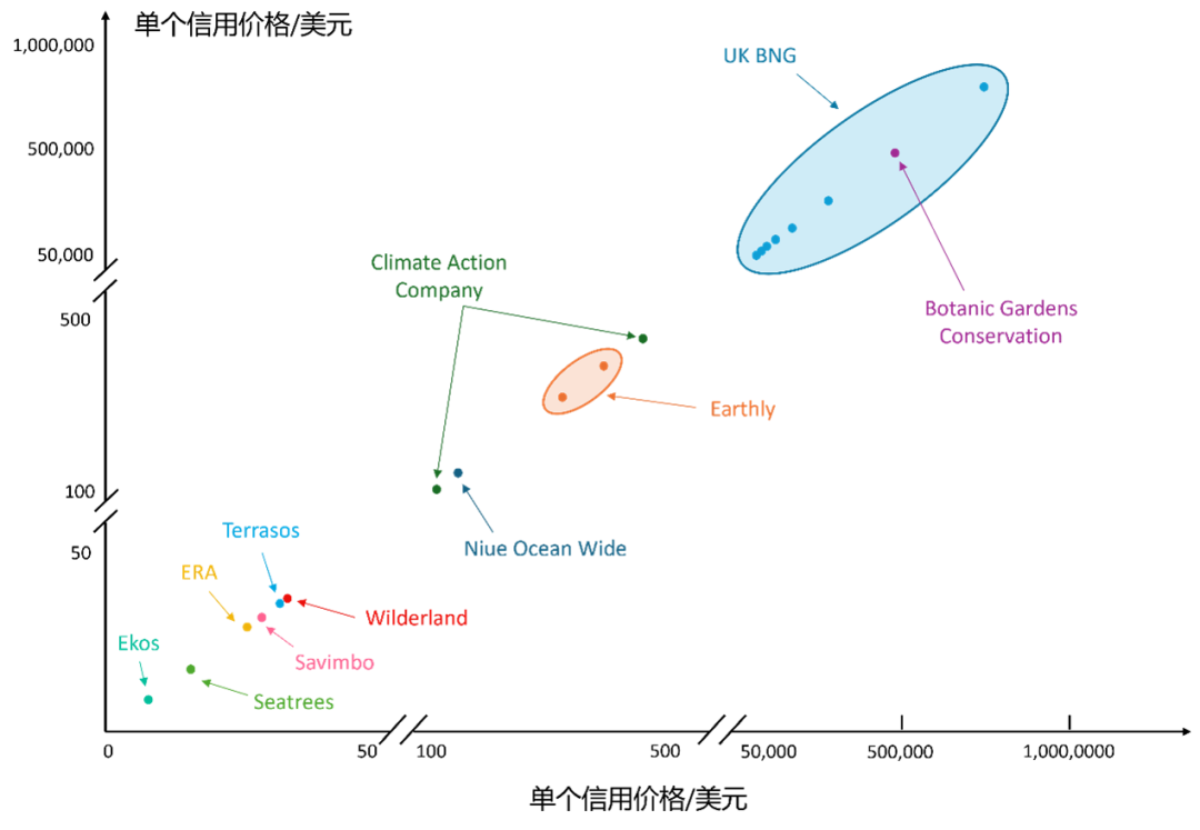 图3 不同生物多样性信用机制下单个信用的价格 © TNC(数据来源:bloomlabs; OPIS; DEFRA)