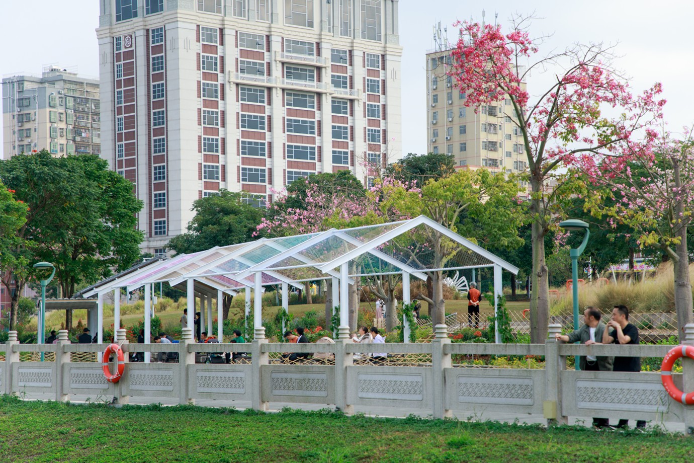 在设计纳凉空间时,以绿廊的形式,与爬藤植物结合,沿承社区内本土客家屋的风格,以“三间两廊”建筑原型设计凉亭,待植物茂盛生长后,这里能成为荫凉通透的休憩场所。