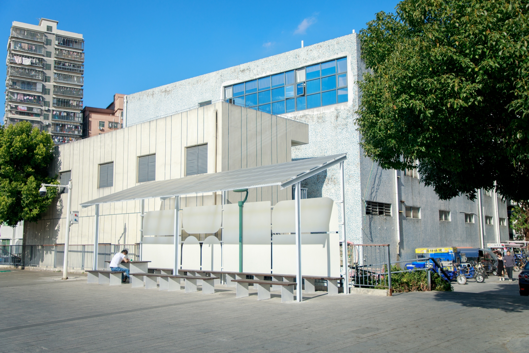 结合居民议事会的建议,项目团队将这片闲置空地改造为“清凉河岸”提升点:搭建遮阳遮雨棚,布置可容纳一个班家长的休憩座椅,让原本拥挤、暴晒的等候区,由此蜕变为安全、舒适、清凉的庇护所。
