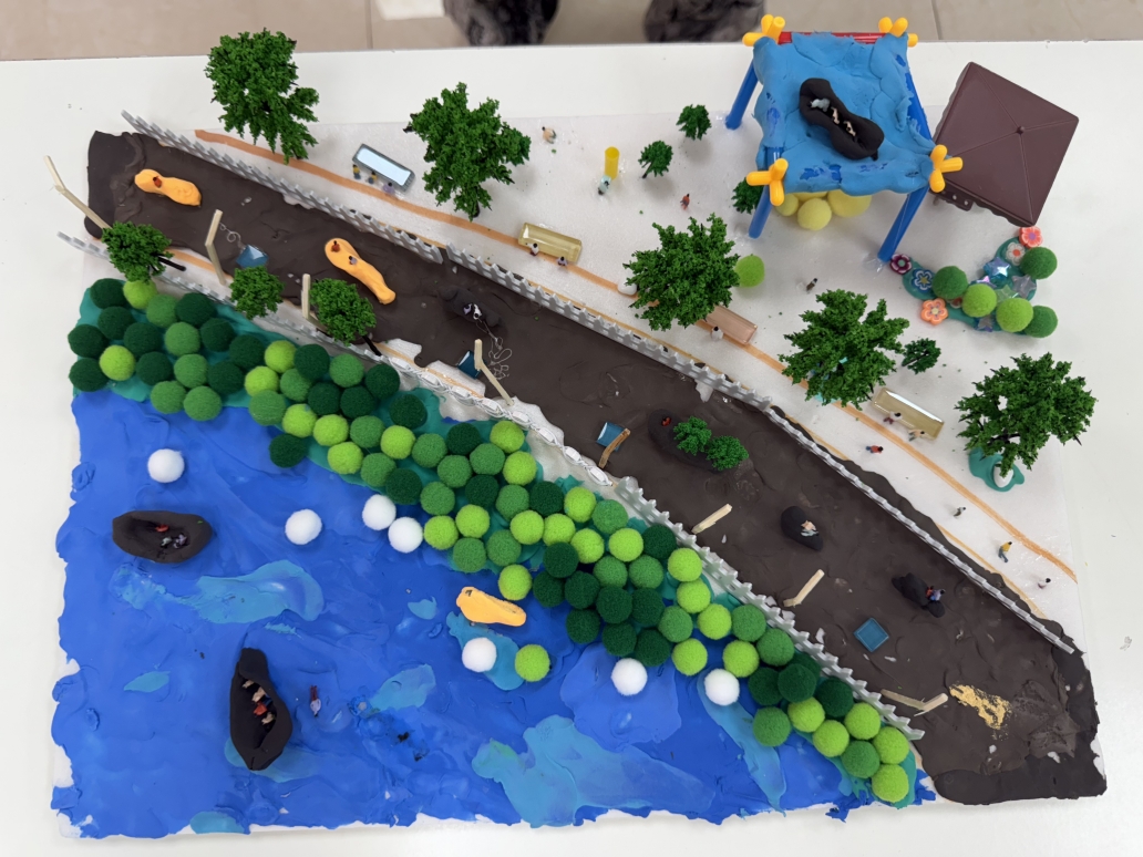 这些朴素又充满童趣的想法,为“清凉河段”的设计注入了温暖与创意——凉亭的遮荫设计、休憩长椅的点位布局,乃至是墙面的彩绘,都融入了孩子们的创意,让这片空间不仅能应对气候挑战,更充满了童真与生机。