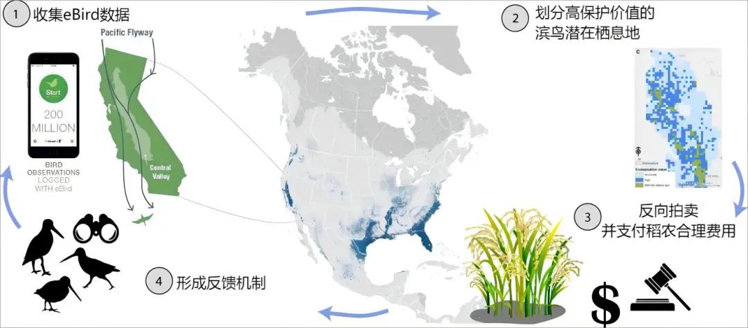 候鸟归家项目由TNC与加利福尼亚州奥杜邦协会(Audubon California)、蓝角科学保护中心(Point Blue Conservation Science)合作成立的候鸟保护伙伴关系(Migratory Bird Conservation Partnership, MBCP)实施。项目创新结合了公民科学、遥感影像和模型预测的方法整合各类数据,预测候鸟迁徙的时间和栖息地点,进而分析出需要创建“快闪式”湿地的时间和地点,选择出高保护价值的潜在栖息地。在确定关键栖息地后,TNC会与加州水稻委员会合作,邀请农民提交出租稻田的出价标书,通过反向拍卖的方式向TNC出价。TNC对比模型结果后选择优先地块,支付农民进行稻田淹水管理的合理费用。最后基于公民科学采集实地数据,定期进行鸟类调查和项目监测。
